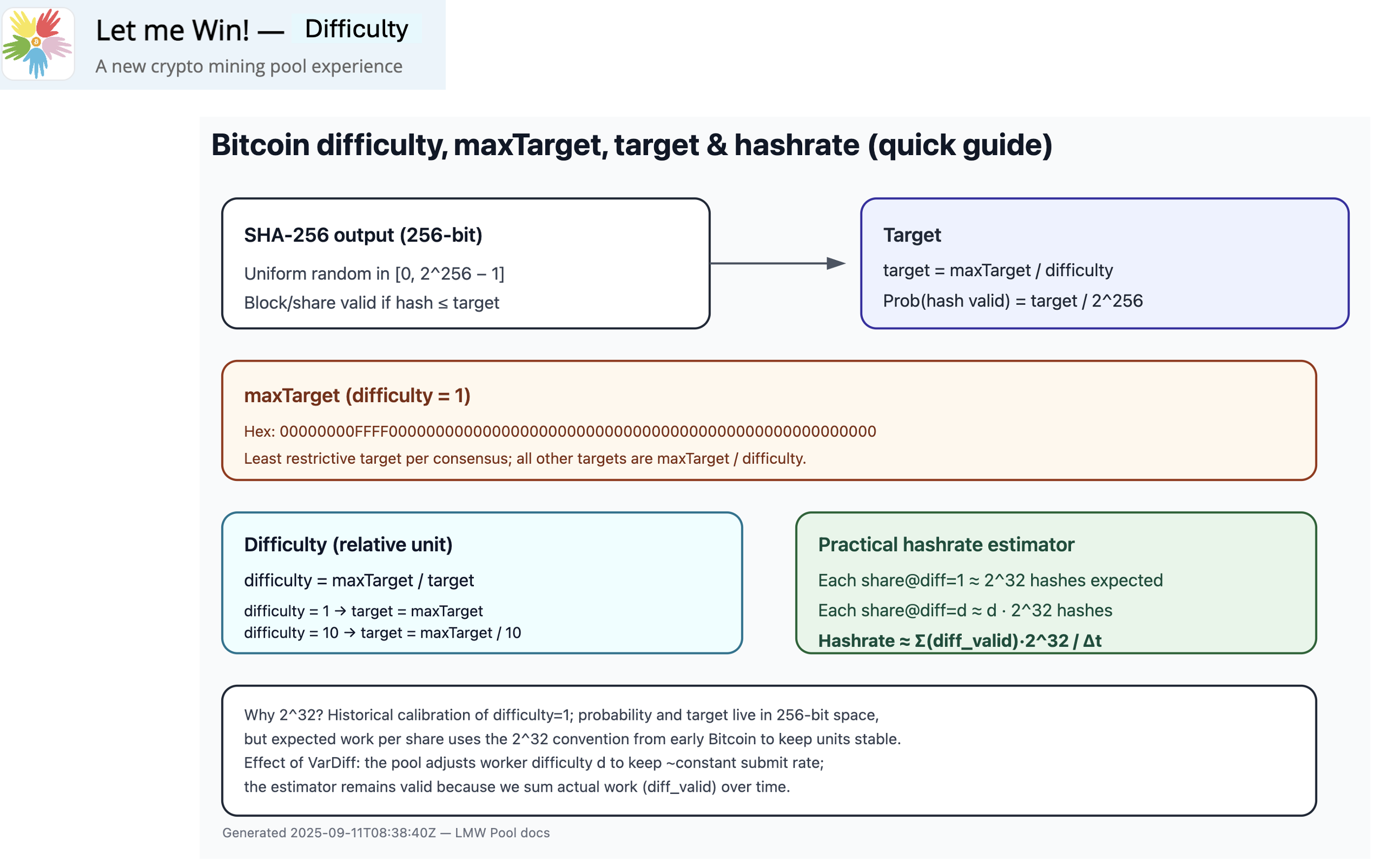 Visual quick guide to maxTarget, target, difficulty and the 2^32 work-per-share rule.